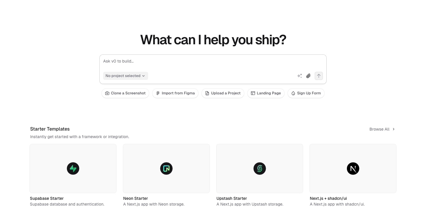V0 dev에 들어가면 이런 화면이 보이는데, 저기에 만들고싶은 프로젝트를 넣어주면 된다.