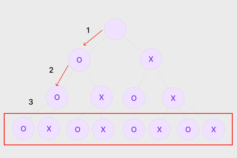 부분집합 트리는 원소가 포함되는 경우, 포함되지 않는 경우에 따라 양쪽으로 나뉜다.