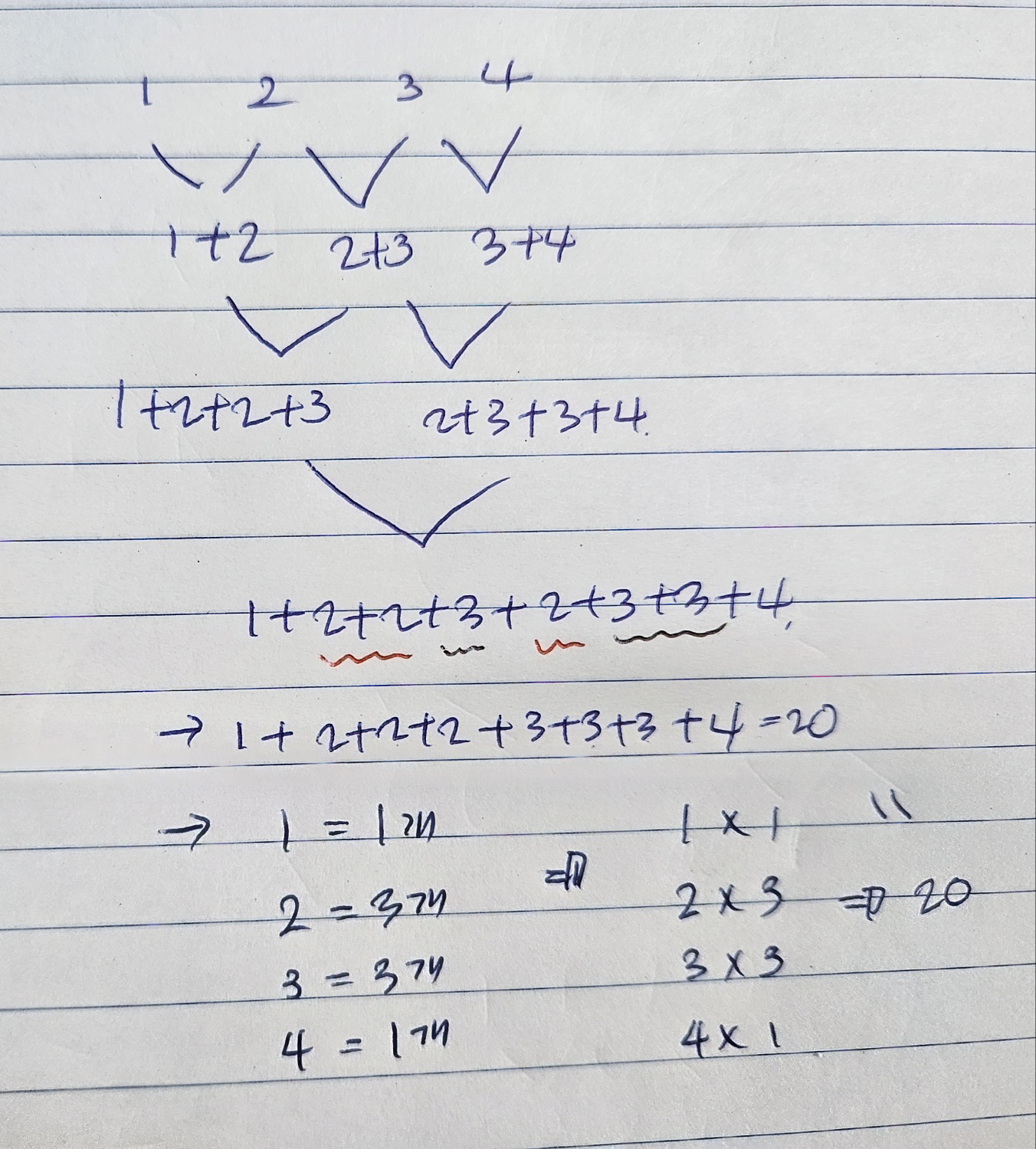 이를 좀 더 보기 편하게 곱으로 바꿔보면, 1*1 + 2*3 + 3*3 + 4*1이 된다.