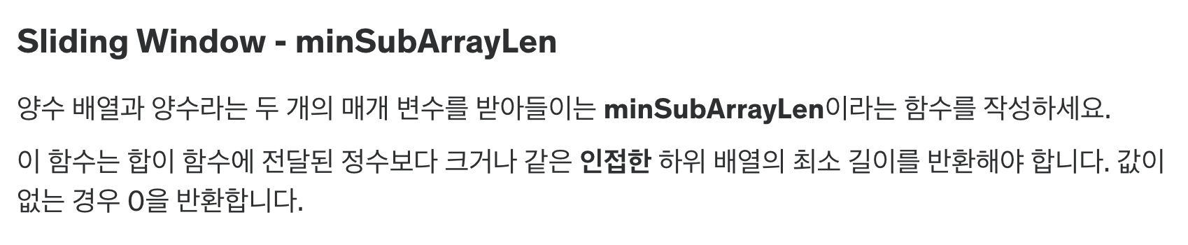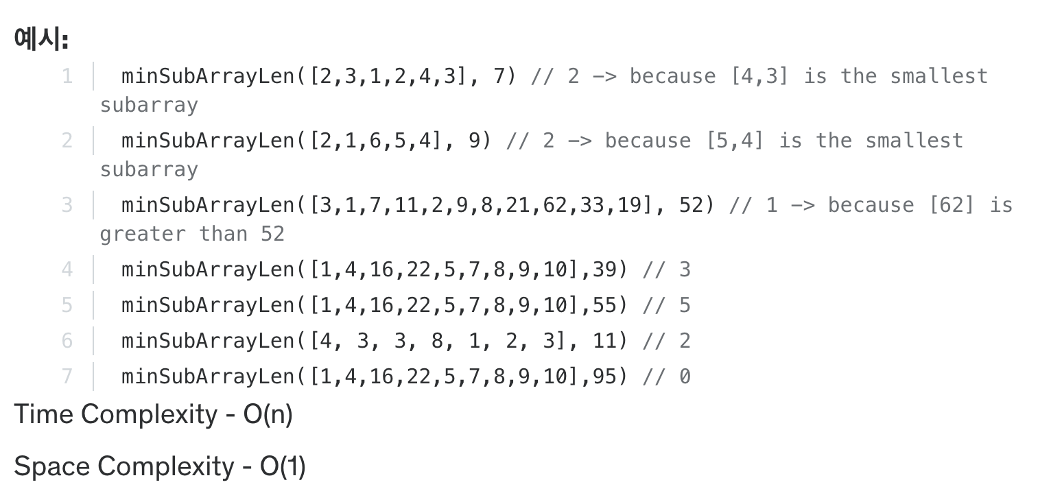 위 문제는 주어진 배열의 합이 숫자랑 같거나 큰 경우, 해당 배열합의 최소 길이를 반환하는 문제이다.