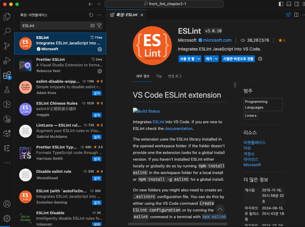 Prettier와 마찬가지로, vscode에서 확장팩으로 설치가 가능하다.