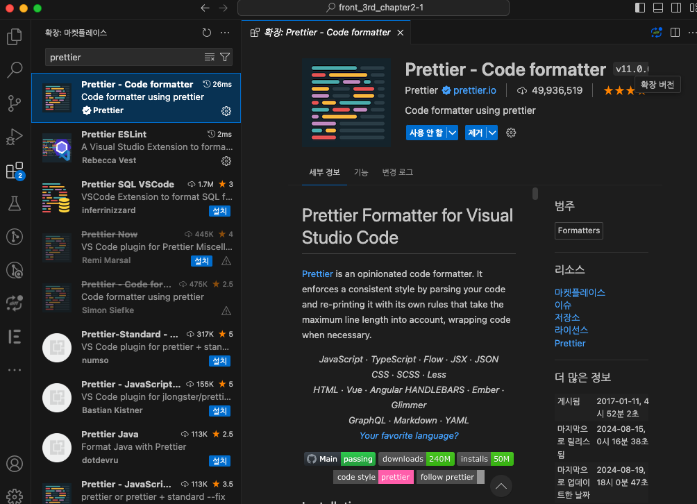 이런식으로 vscode에서 estension을 설치해 주면, 에디터에서 실시간으로 코드 포맷팅을 적용할 수 있다.