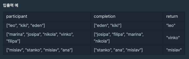 마라톤에 참여한 선수들의 이름이 담긴 배열 participant와 완주한 선수들의 이름이 담긴 배열 completion이 주어질 때,