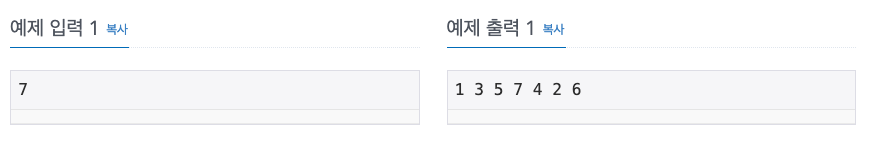N이 주어졌을 때, 버린 카드들을 순서대로 출력하고, 마지막에 남게 되는 카드를 출력하는 프로그램을 작성하시오.