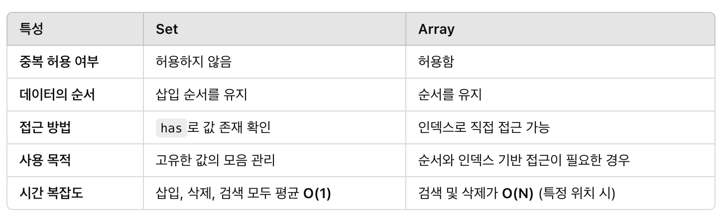 set의 경우 배열과 달리 데이터 검색, 삭제, 삽입 모두 O(N)이기 때문에, 이런 경우엔 set을 사용하는 게 좋다.