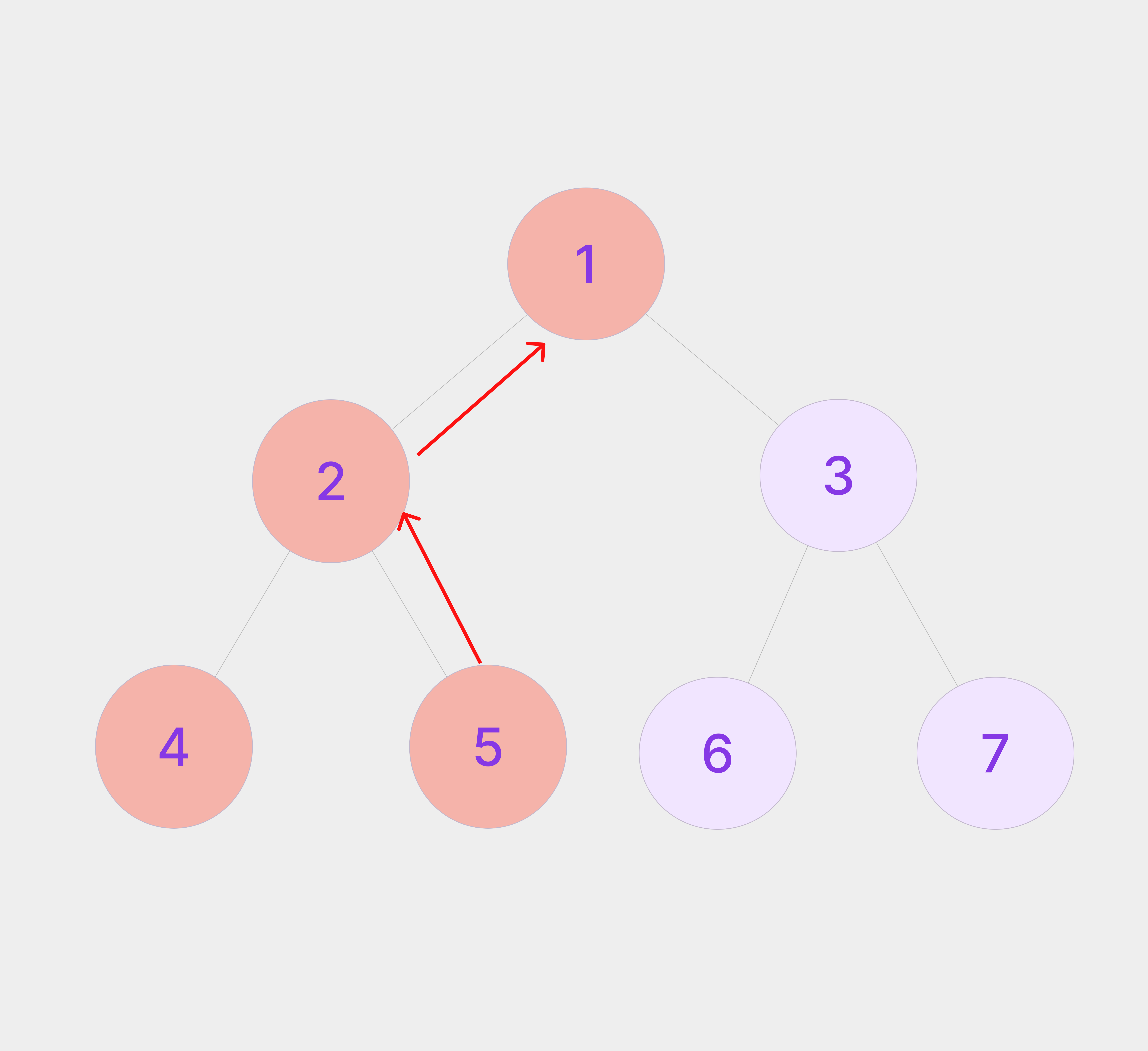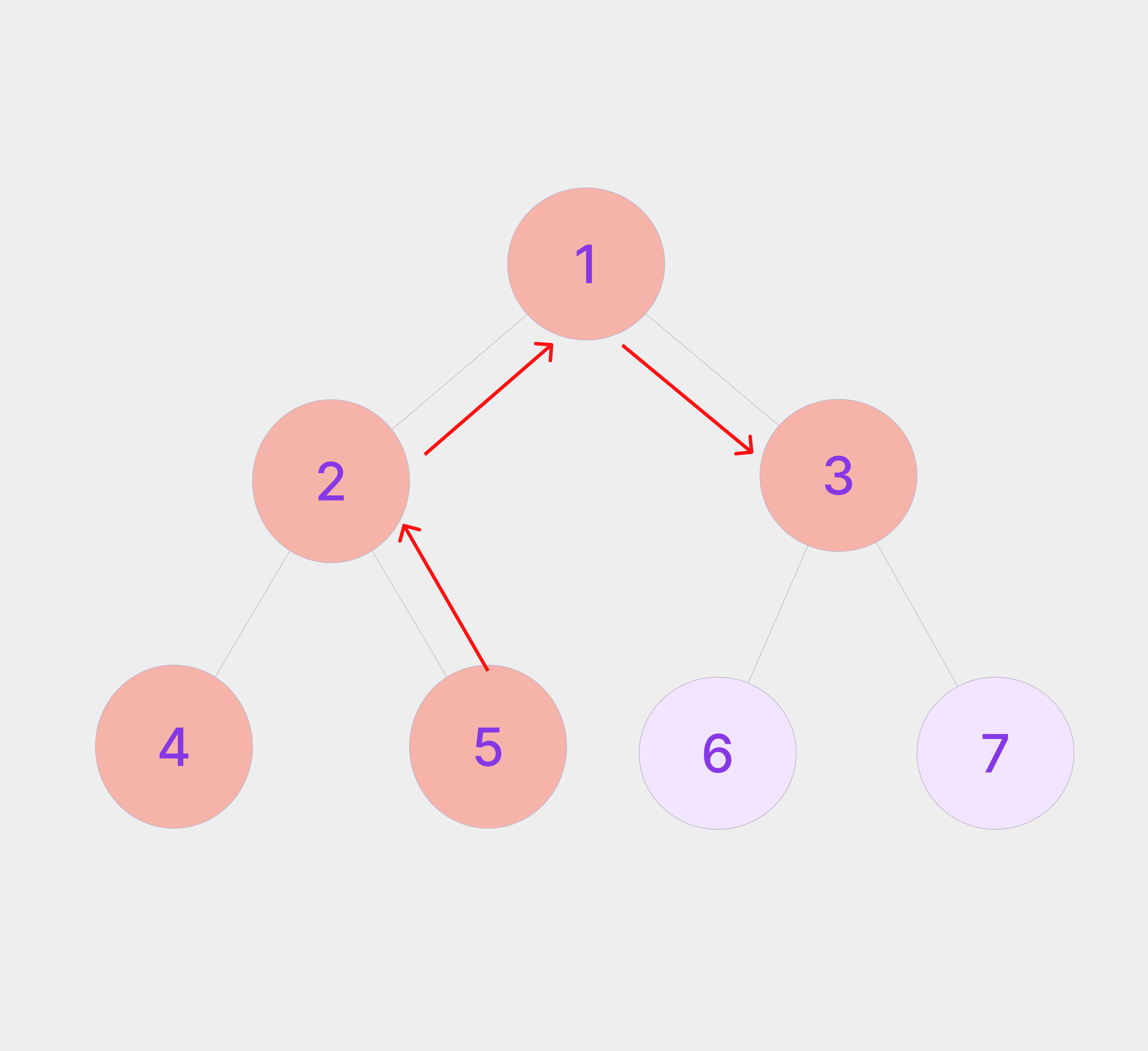 5번 노드 탐색이 끝난 후, 아래에 더 이상 노드가 없으므로 부모 노드로 올라간다.