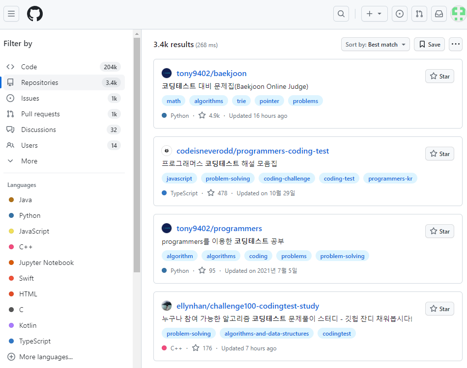 Github에서 코딩테스트를 검색하면 다양한 문제들을 확인할 수 있다.