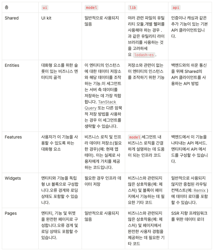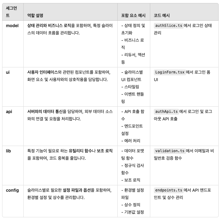 FSD의 폴더 구조는 Layers > Slices > Segments로 구성되어 있다.