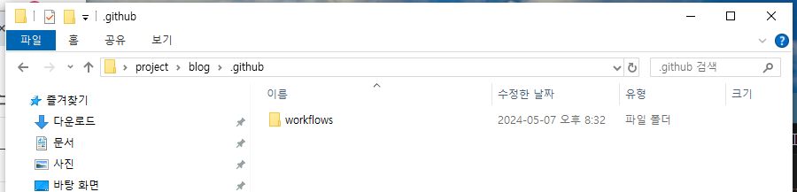 위 사진에서는 blog 가 저장소 루트이기 때문에 이 안에 ' .github/workflows' 폴더를 만들었다.