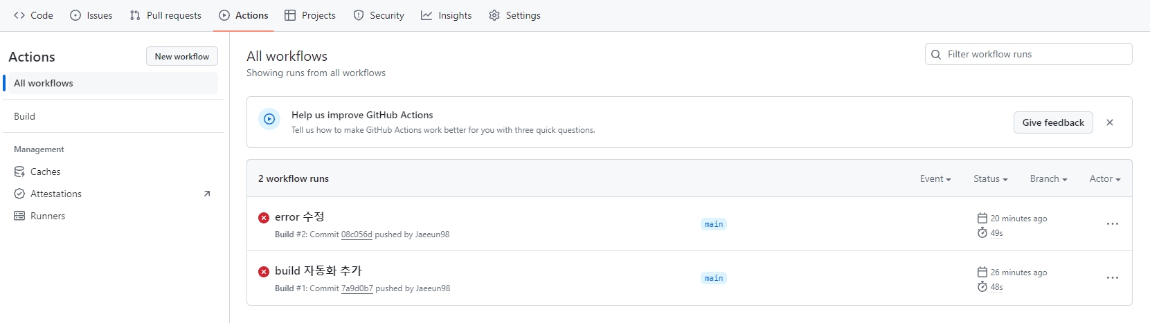 자동화 워크플로우가 제대로 실행됐는지 확인하고 싶다면 GitHub > Actions를 들어가 보면 된다.