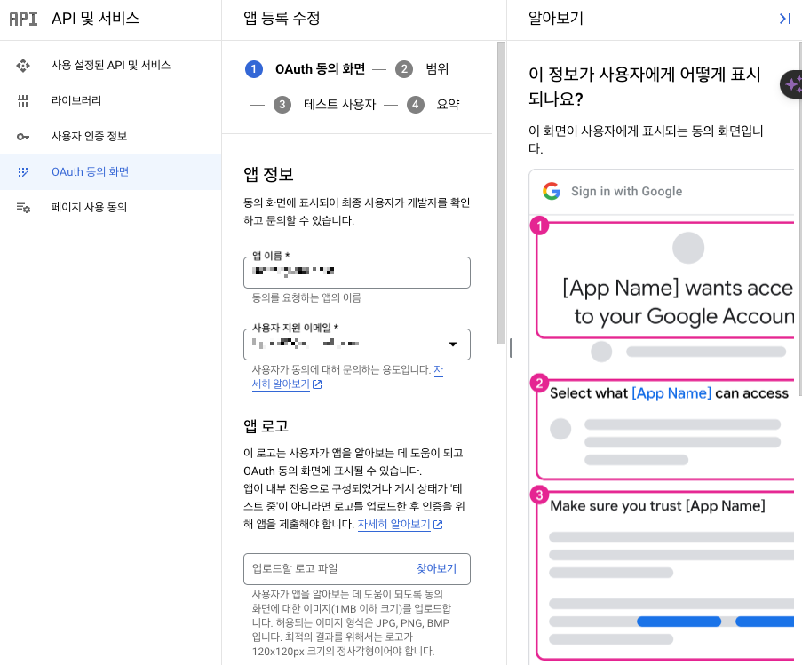 우선, 구글 API로 들어간 후, Oauth 동의 화면으로 들어간다.