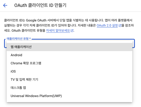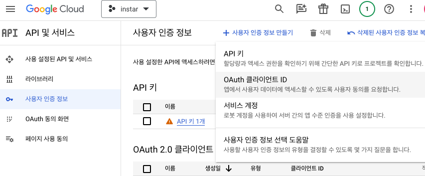그 후, 사용자 인증 정보 > 사용자 인증 정보 만들기 > OAuth 클라이언트 ID를 눌러준다.
