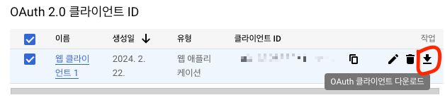 혹시 까먹었다면, 사용자 인증 정보 > OAuth > 다운로드를 클릭하면, 아이디와 비밀번호를 확인할 수 있다.